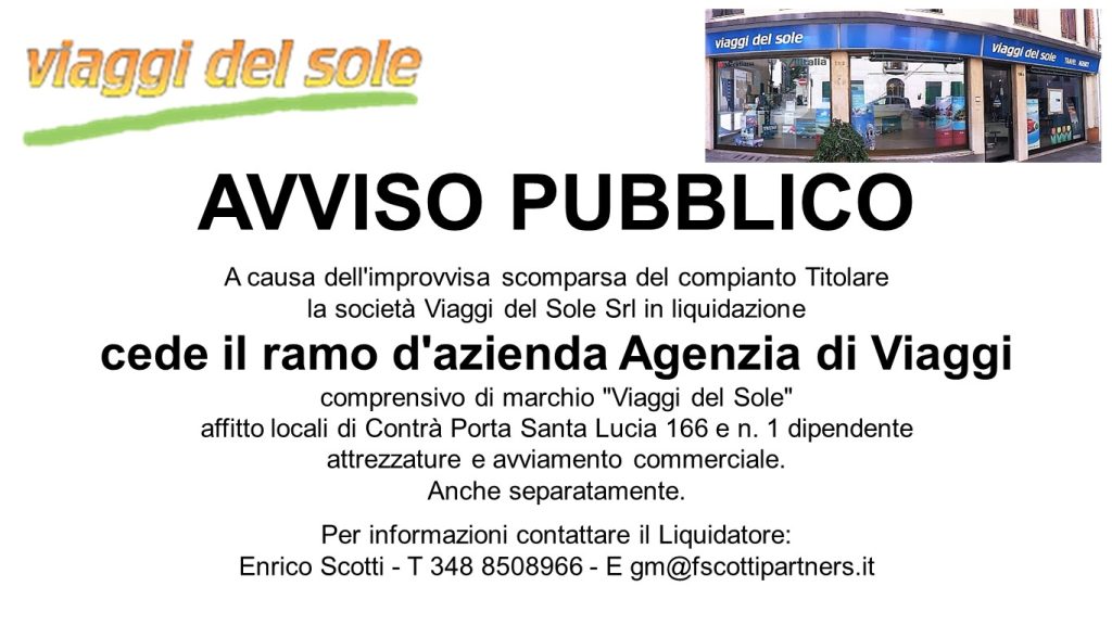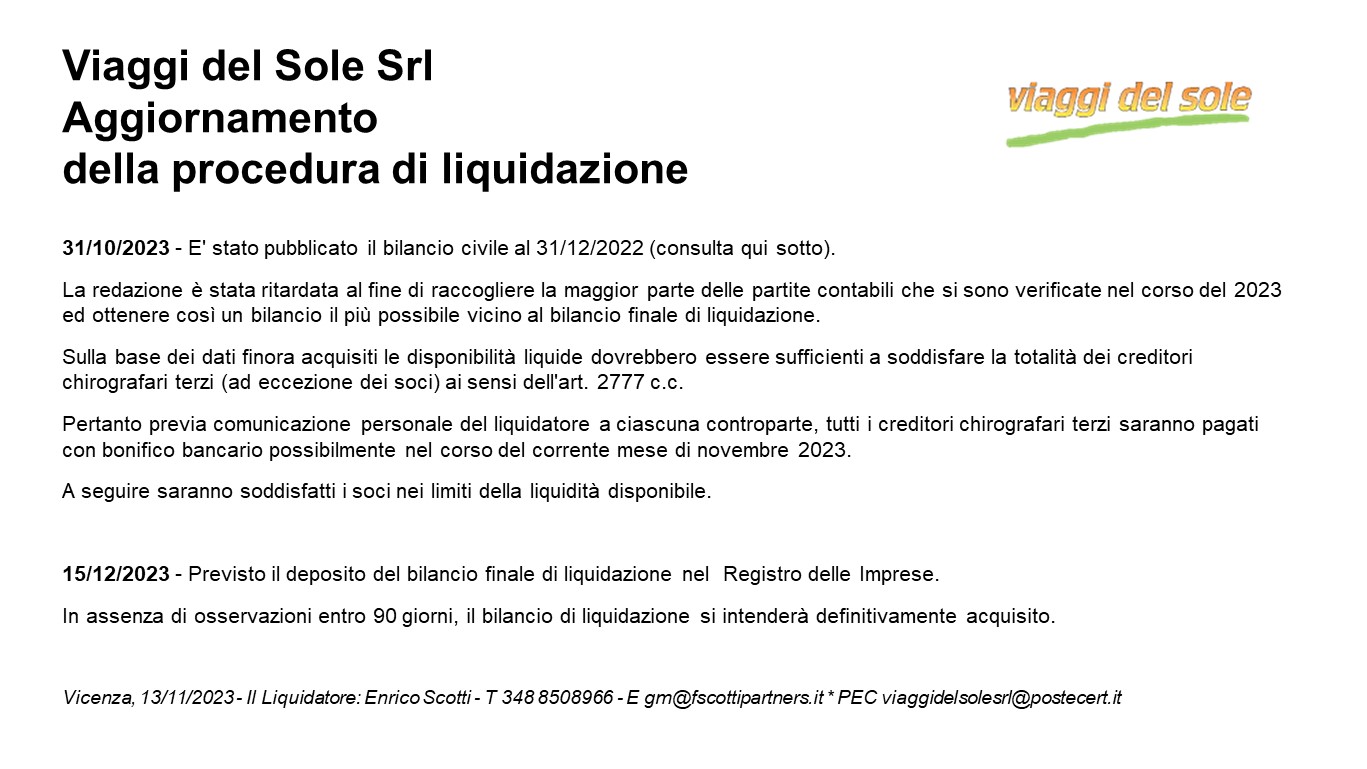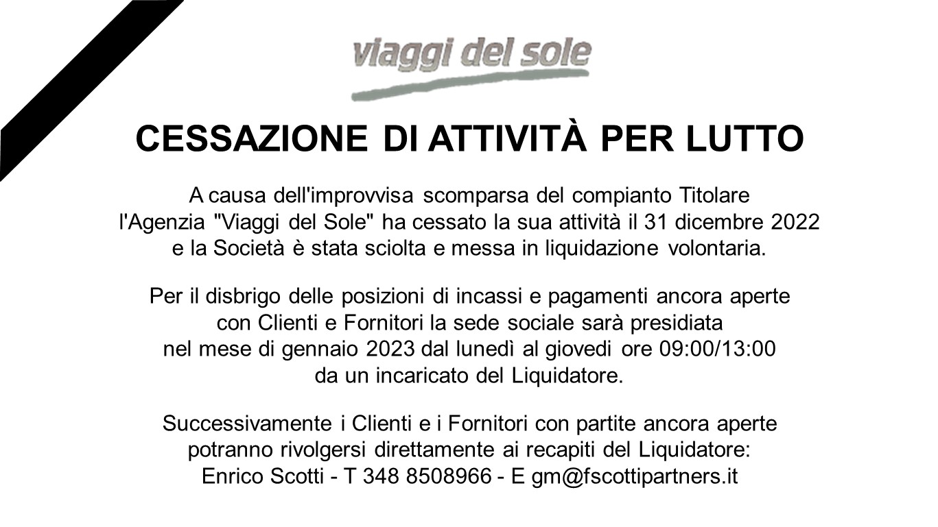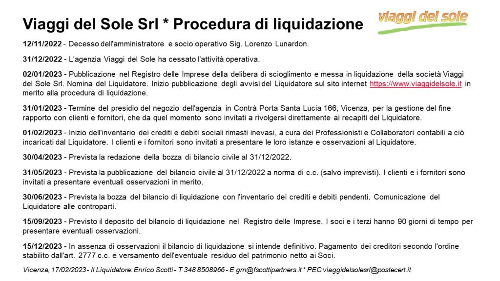 Liquidazione Viaggi del Sole Srl * Avvisi pubblici del Liquidatore Enrico Scotti – T 3488508966 – E gm@fscottipartners.it * Pec viaggidelsolesrl@postecert.it